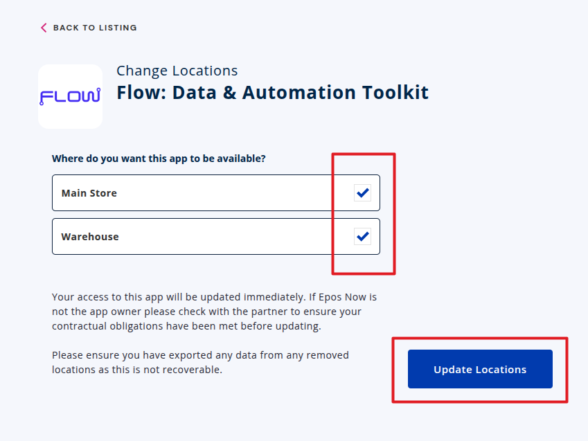 If you need to change which locations an app is installed on, you can do this from My Apps in the Epos Now App Store.