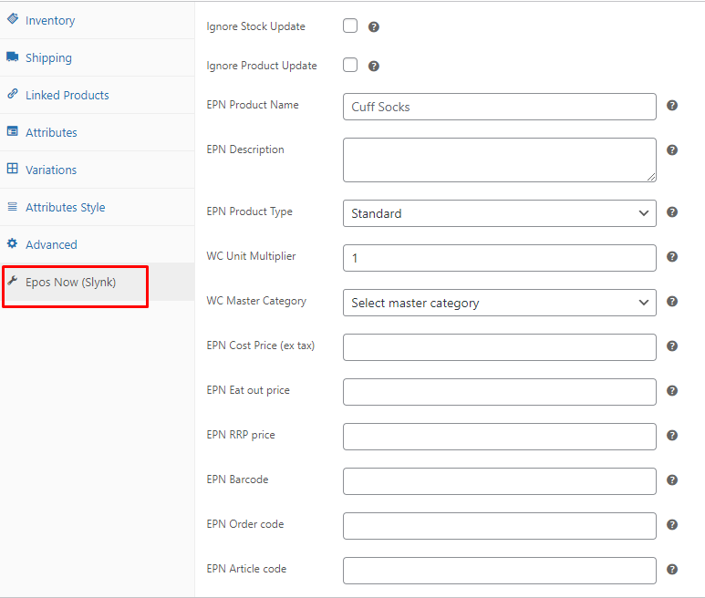 When product sync is enabled, you will see additional fields for EposNow product data in your WooCommerce admin panel.