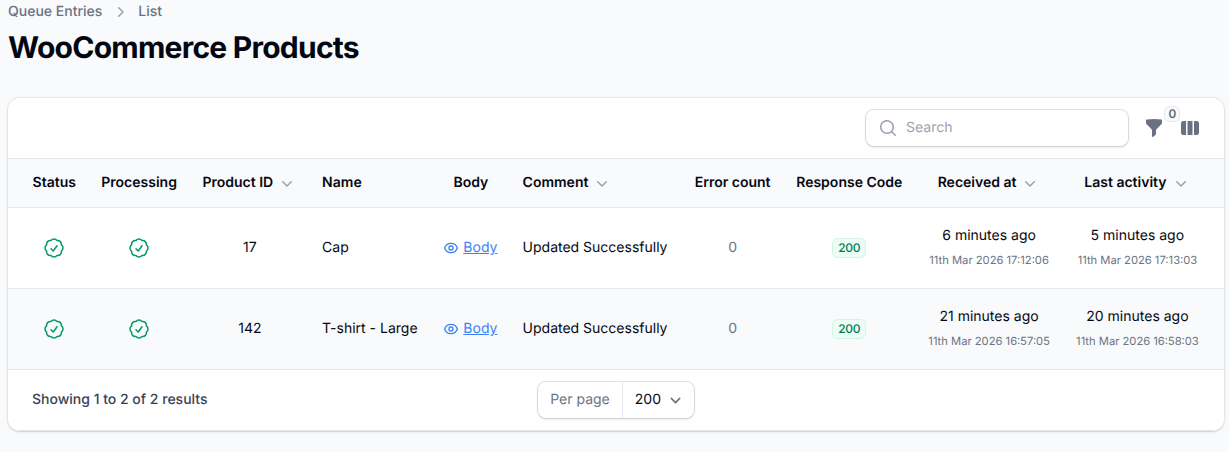 This shows product updates received from WooCommerce to sync to Epos Now.