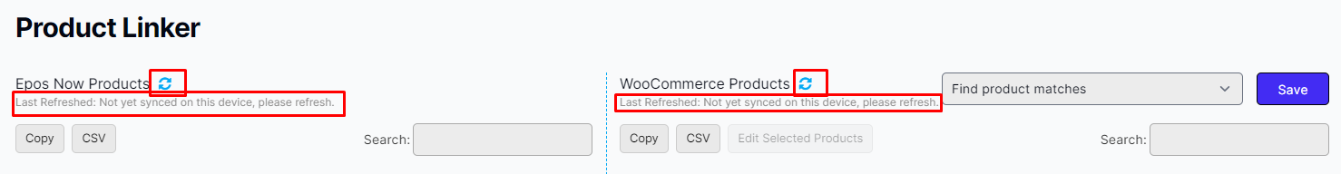 You can click on the blue refresh icons on both sides to fetch the products from EposNow and WooCommerce. The speed of this will depend on how quickly the EposNow API and WooCommerce API on your website are responding. Refresh these one at a time and wait for the fetch to complete and you will then see all the products on both sides.