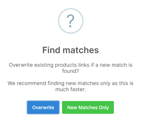 This will try to find matches based on the criteria you select. We recommend selecting the option to find new matches only as this is much quicker. You can use the overwrite option if required, but this can take a bit more time to run as it has to go through all the products including the ones that are already linked.