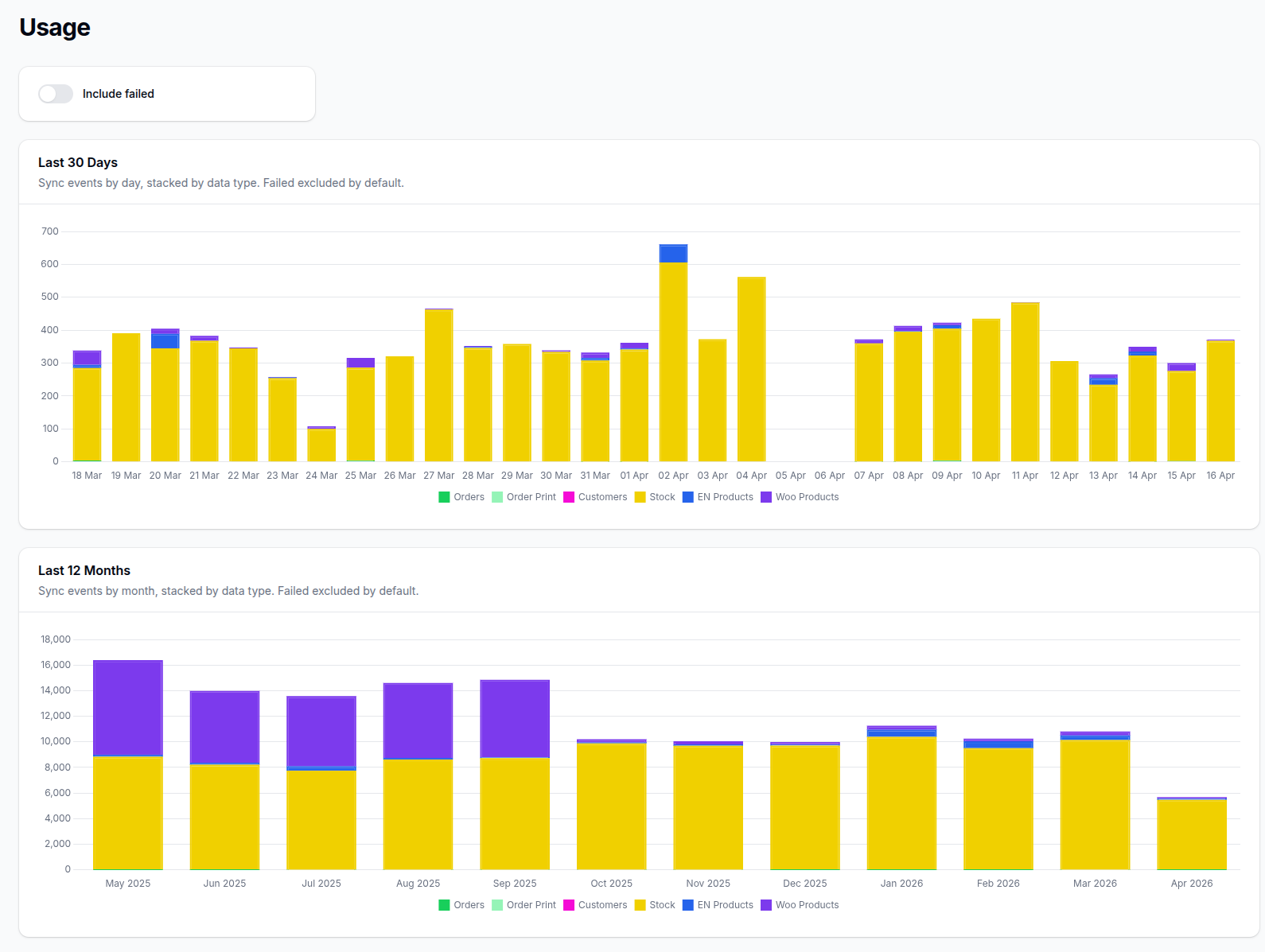 Log in to the Slynk Dashboard, open your Epos Now WooCommerce app, and click Usage in the left hand menu.