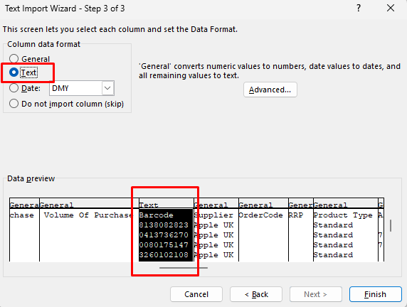 On newer versions of Excel, this screen will look slightly different to the screenshot below, but all you need to do is select the column and set the format as text (shown as an ABC icon)