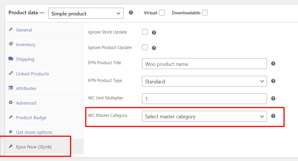 - This can be found on the product edit page in WooCommerce under the EposNow (Slynk) tab