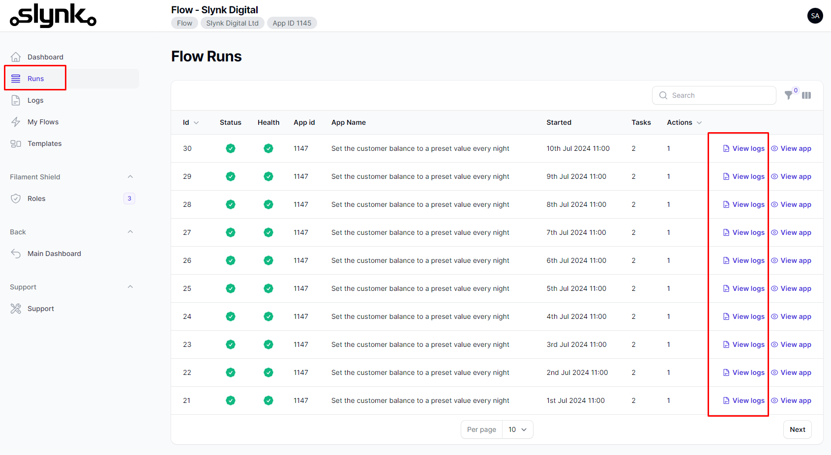For each flow run, use View Logs to open the matching log entries.