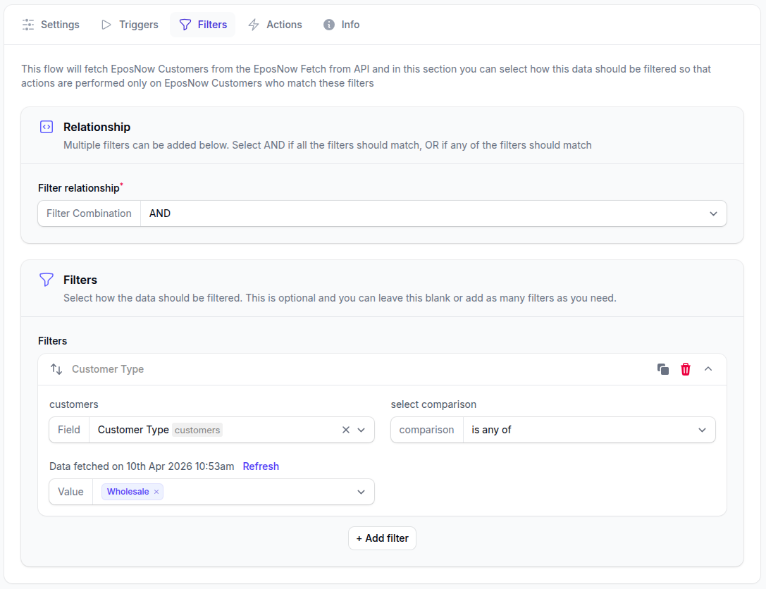 The Filters tab decides which records should continue through to the action stage. If the record does not pass the filter checks, then no actions are taken on it.