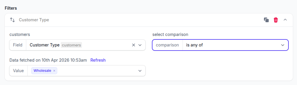 In the example above, we are filtering by the Customer Type field from the Customer data type, and checking if the value is Wholesale.