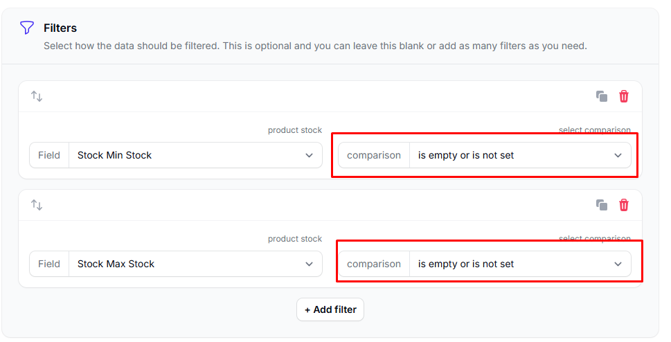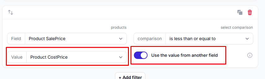 Some filters can also use the value from another field instead of a fixed value. For example, to check if the SalePrice is greater than the CostPrice for a product.