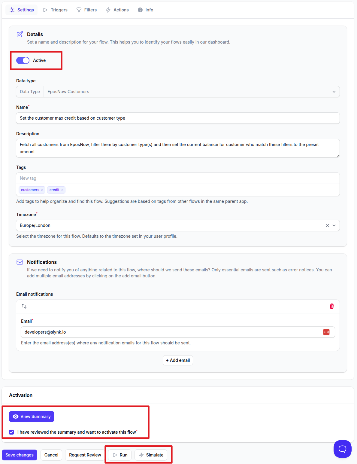 This sends a review request to the Slynk team so the flow can be checked through with you.
